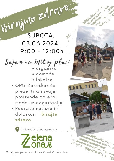 U subotu 8.6.2024. od 9 do 12 sati na mićoj Jakovarskoj placi će se održati sajam “Birajmo zdravo” koji okuplja biološke i male lokalne proizvođače koji se drže domaćeg i zdravog načina proizvodnje.
