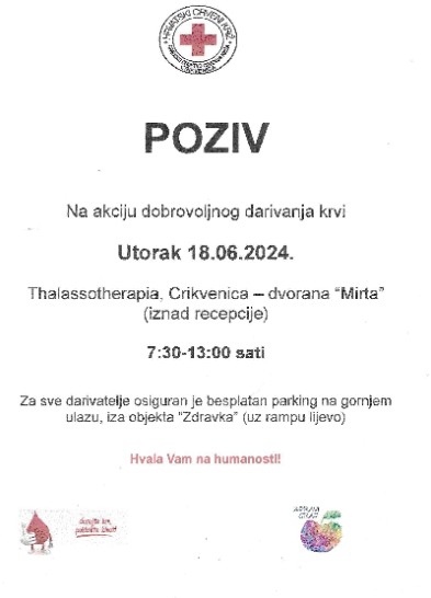 Akcija će se održati u prostoru Thalassotherapije, Crikvenica – dvorana „Mirta“ iznad recepcije, u terminu: