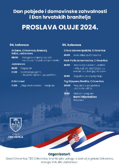 Grad Crikvenica dvodnevnim će programom proslaviti Dan pobjede i domovinske zahvalnosti i Dan hrvatskih branitelja. Program će se održati 4. i 5. kolovoza 2024. godine. Ovaj poseban događaj obilježit ćemo nizom aktivnosti koje će nas podsjetiti na hrabrost i žrtvu naših branitelja te na slavnu pobjedu u Domovinskom ratu.