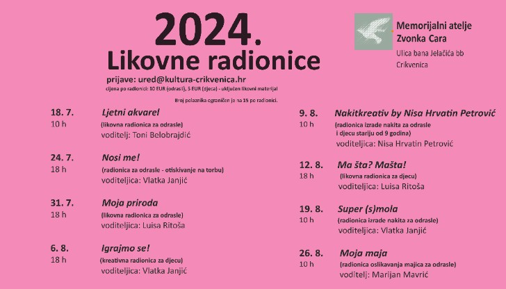 U organizaciji Centra za kulturu “Dr. Ivan Kostrenčić” počele su se održavati kreativne radionice za djecu i odrasle u Memorijalnom ateljeu Zvonka Cara u Crikvenici. Osim učenja novih likovnih tehnika, polaznici će ove godine imati priliku i izraditi nakit, otisnuti cvijeće ili voće na platnenu torbu te oslikati originalnu majicu.