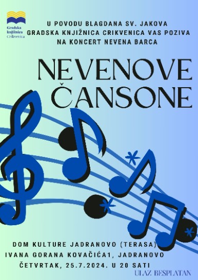 U povodu proslave blagdana svetog Jakova nebeskog zaštitnika Jadranova, pozivamo vas na koncert Nevena Barca – Nevenove čansone na terasu Doma kulture Jadranovo u četvrtak 25.7. u 20 sati.