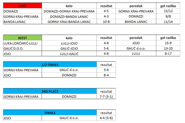 Naslov pobjednika pripao je ekipi “Galić d.o.o.” koja je u finalu nakon izvođenja peteraca pobijedila ekipu “Joja i prijatelji”.