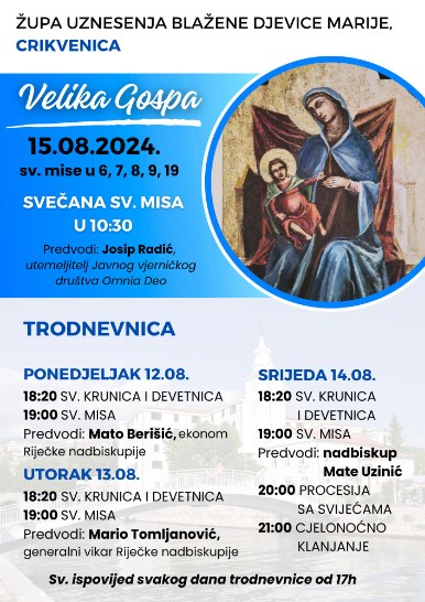 Na dan Velike Gospe, u četvrtak 15.08. Svete mise su u 6, 7, 8, 9, 19 sati i svečana Sv. misa u 10:30 sati, a predvodi je Josip Radić, utemeljitelj Javnog vjerničkog društva Omnia Deo.