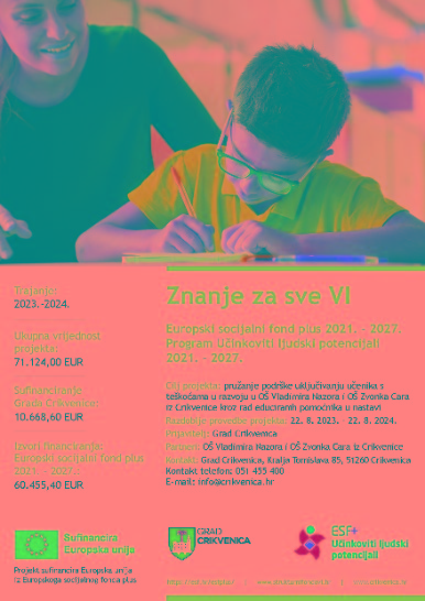U prošloj školskoj godini kroz projekt „Znanje za sve VI“ potporu je dobivalo 10 učenika, a u idućoj školskoj godini potpora će biti potrebna 11 učenika. Vrijednost projekta „Znanje za sve VI“ je 71.124,00 EUR, od kojih je 60.455,40 sufinancirano iz Europskog socijalnog fonda plus, a 10.668,60 EUR sufinancirao je Grad Crikvenica proračunskim sredstvima.
