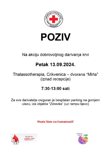Akcija će se održati u prostoru Thalassotherapije, Crikvenica – dvorana „Mirta“ iznad recepcije,