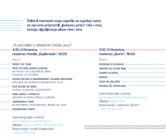 Listopad nam donosi „ljubavnu priču“ u dvama crikveničkim restoranima – spoj plave ribe i dobre kapljice vina uz ambasadorice kvarnerskog vinskog podneblja. 4. listopada u restoranu Hotela „Esplanade“ uživajte na uparivanju ribljih specijaliteta s vinima pod vodstvom sommelierke Lucije Matijević.