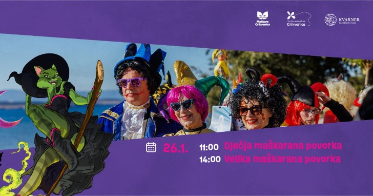– 26. siječnja slijedi kruna crikveničkih „Maškara“ – Velika i Dječja maškarana povorka. Nakon povorki nas zabavlja Mauro Staraj & „La Bande“.