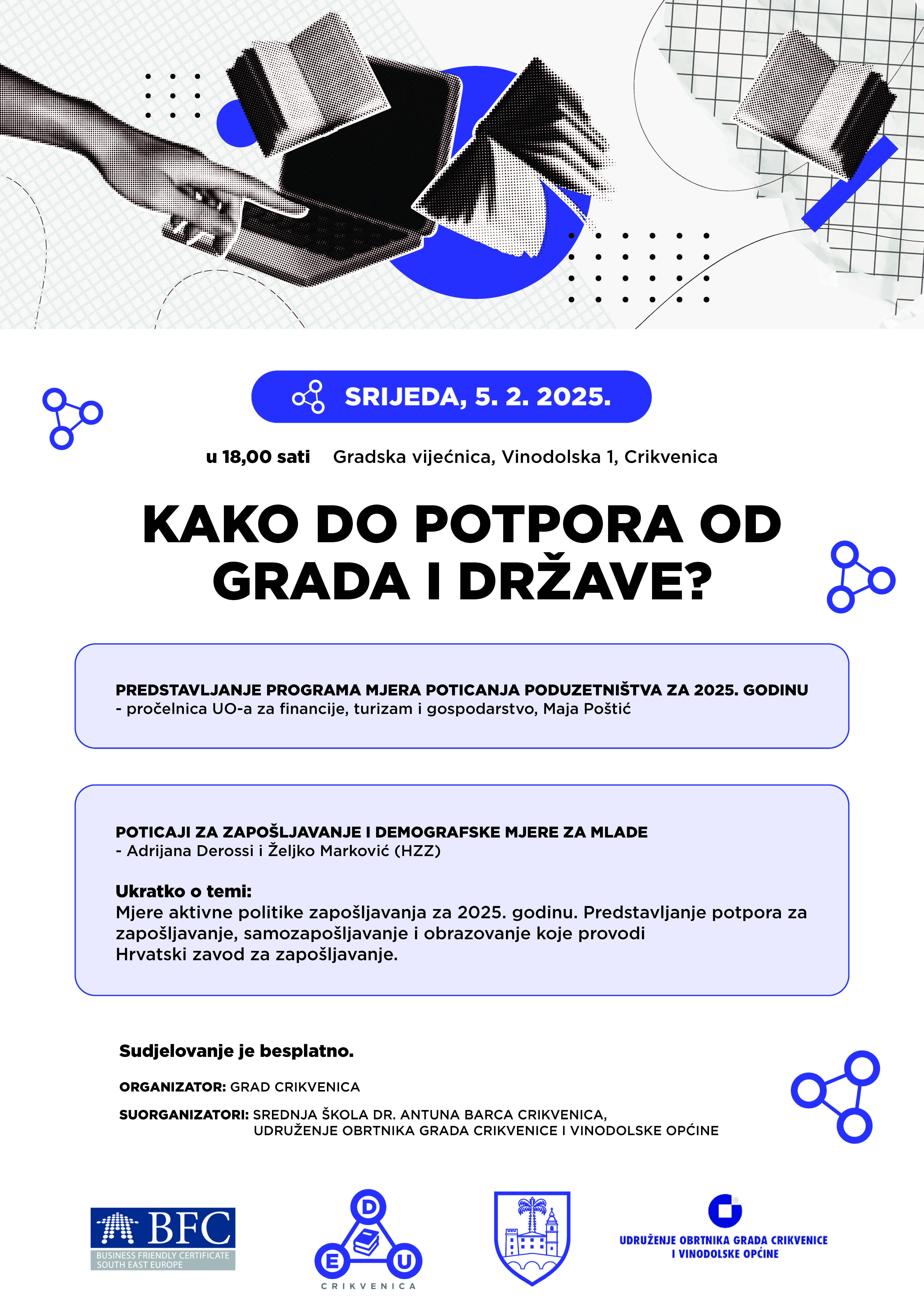 Adrijana Derossi i Željko Marković iz Hrvatskog zavoda za zapošljavanje održati predavanje na temu „Poticaji za zapošljavanje i demografske mjere za mlade“, u sklopu kojeg će predstaviti mjere aktivne politike zapošljavanja za 2025. godinu, potpore za zapošljavanje, samozapošljavanje i obrazovanje koje provodi HZZ.