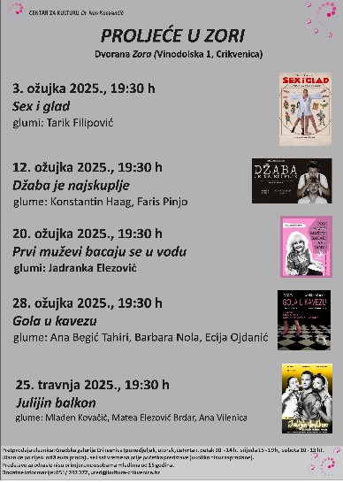 Uskoro počinje “Proljeće u Zori” s pet sjajnih predstava – “Sex i glad” (3. ožujka), “Džaba je najskuplje” (12. ožujka), “Prvi muževi bacaju se u vodu” (20. ožujka), “Gola u kavezu” (28. ožujka) i “Julijin balkon” (25. travnja).