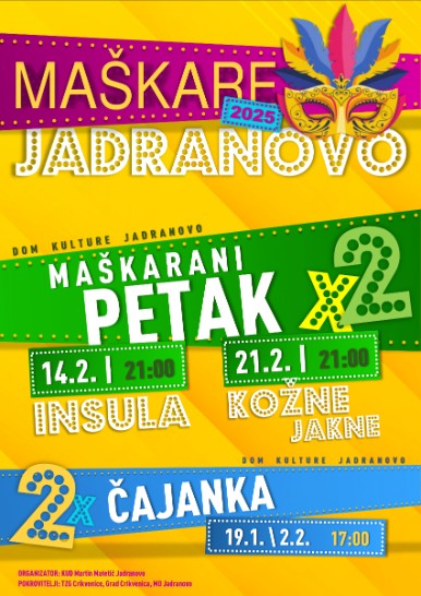 14. veljače u Jadranovu u Domu kulture sve prisutne će zabavljati i rasplesati glazbeni sastav „Insula“, a dan nakon jakovarske krabulje obilazit će svoje mjesto, uz gostovanja drugih maškaranih skupina.