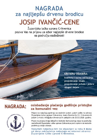 Županijska lučka uprava Crikvenica poziva Vas na prijavu za izbor najljepše drvene brodice na području nadležnosti. Nagrada Josip (Joško) Ivančić Cene nosi naziv po najistaknutijem brodograditelju crikveničkog kraja koji je u svojoj radionici proizveo više od 50 plovila od kojih mnoga i danas krase crikveničke luke i razna druga mjesta na Jadranu.