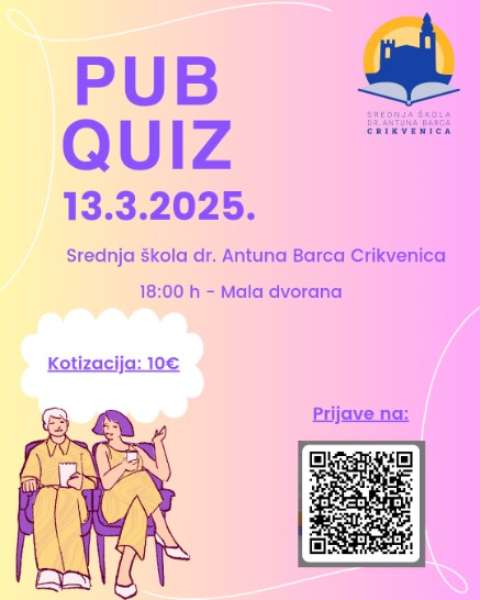 U četvrtak, 13. ožujka, s početkom u 18:00 sati, u Srednjojškoli dr. Antuna Barca održava se pub kviz!