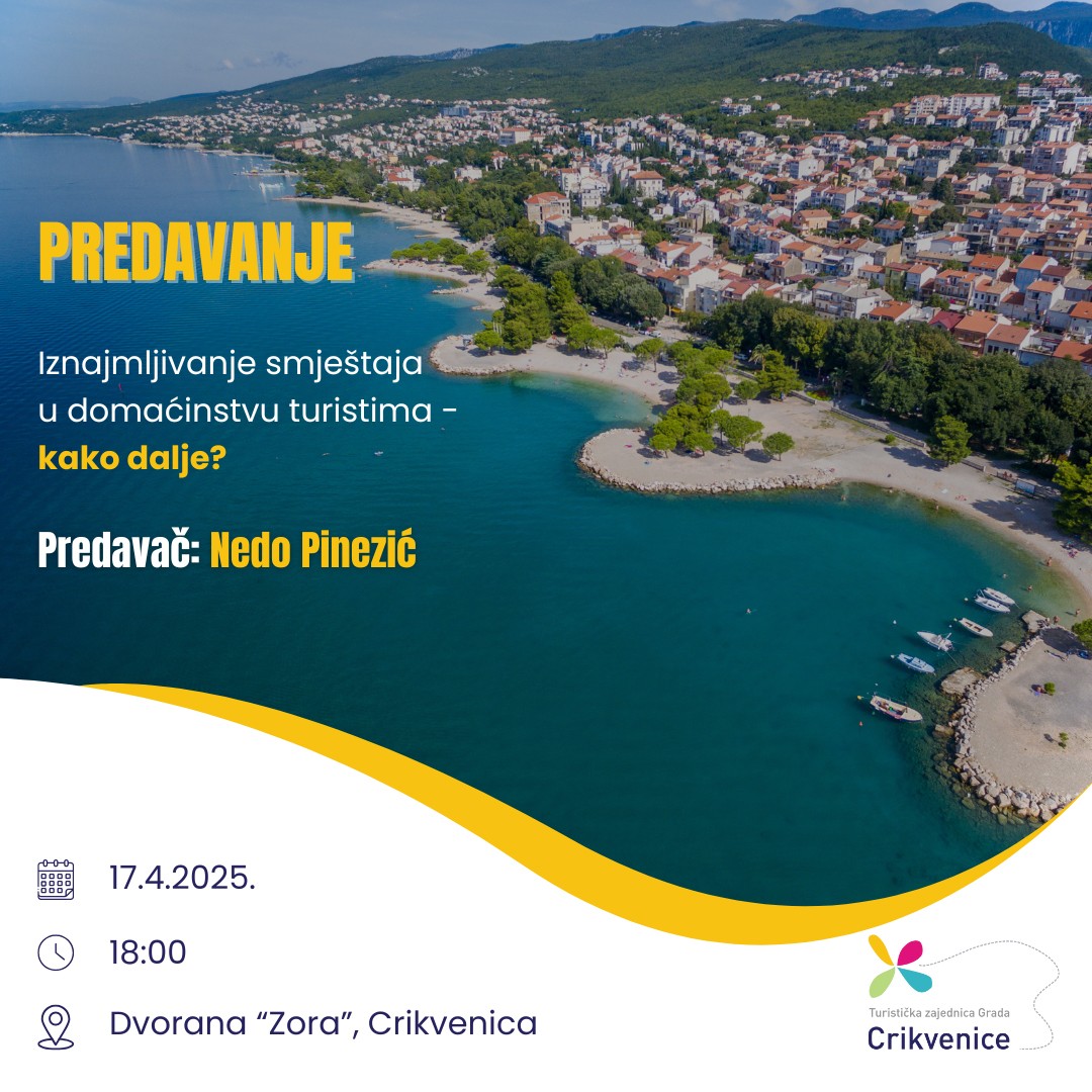 Predavanje za iznajmljivače u domaćinstvu na temu „Iznajmljivanje smještaja u domaćinstvu turistima – kako dalje?“, održat će se u četvrtak, 17. travnja od 18:00 sati u crikveničkoj dvorani „Zora“.