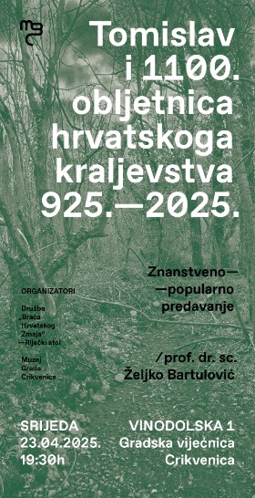 Muzej Grada Crikvenice u suradnji s Družbom „Braća Hrvatskog Zmaja“ – Riječki stol organizira znanstveno  ̶  popularno predavanje „Tomislav i 1100 godina hrvatskog kraljevstva 925. – 2025.“