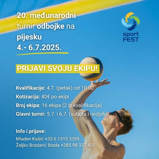 Počele su prijave za veliki 20. međunarodni turnir odbojke na pijesku. Turnir će se održati od 4. do 6. srpnja na odbojkaškom igralištu na Glavnoj gradskoj plaži, u sklopu ovogodišnjeg SportFesta.