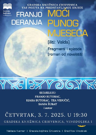 Gradska knjižnica Crikvenica poziva na predstavljanje nove knjige Franje Deranje Moći punog mjeseca (iliti: Valda) Fragmenti i epizode (roman od noveleta) koje će se održati u četvrtak, 3. srpnja u Središnjem odjelu Knjižnice, Vinodolska 1.