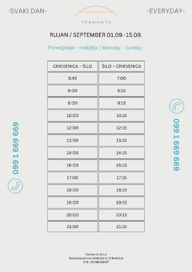 Nakon prošlogodisnjeg iskustva i analize potreba domicila i turista, napravljen je raspored vožnje katamarana Tramonto koji povezuje Crikvenicu i Šilo.