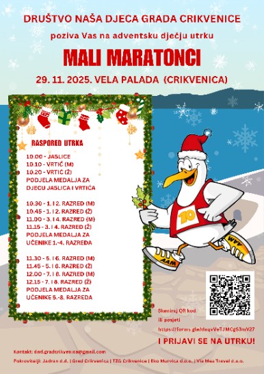 Društvo Naša djeca Grada Crikvenice poziva svu djecu jasličke, vrtićke i osnovnoškolske dobi na adventsku dječju utrku Mali maratonci 29. studenog 2025. na Veloj paladi u Crikvenici.
