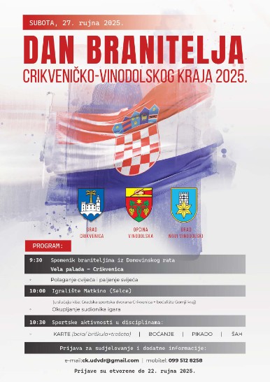 Pozivamo sve hrvatske branitelje s područja Crikvenice, Novog Vinodolskog i Vinodolske općine da se pridruže zajedničkom obilježavanju, druženju i prisjećanju na hrabrost i zajedništvo koje nas je povezalo u najtežim trenucima naše povijesti