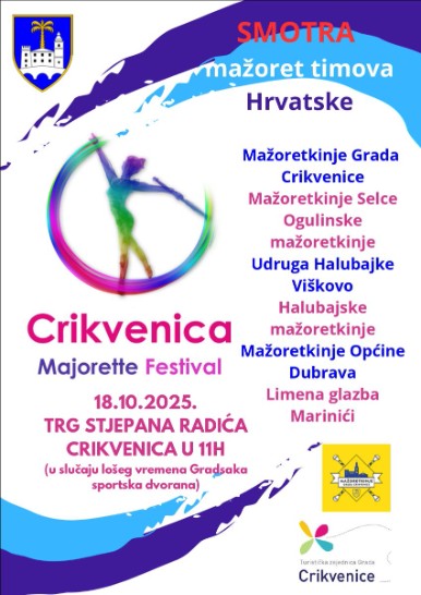 Smotra mažoret timova Hrvatske održat će se u subotu, 18. listopada 2025. godine, s početkom u 11 sati od hotela Miramare prema Trgu Stjepana Radića. Ovaj događaj okupit će mažoret timove iz cijele Hrvatske, koji će svojim nastupima oduševiti sve prisutne. Mažoretkinje Grada Crikvenice, Mažoretkinje Selce, Ogulinske Mažoretkinje, Udruga Halubajke Viškovo, Halubajske mažoretkinje, Mažoretkinje Općine Dubrava te Limena glazba Marinići zvijezde su nadolazeće subote.