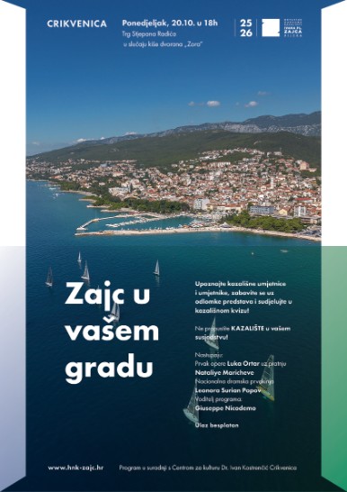 U Crikvenici će nastupiti prvak opere Luka Ortar uz klavirsku pratnju Nataliye Maricheve i nacionalna dramska prvakinja Leonora Surian Popov. Voditelj programa će biti Giuseppe Nicodemo, glumac i prvak Talijanske drame. Program organizira Hrvatsko narodno kazalište Ivana pl. Zajca u suradnji s Centrom za kulturu Dr. Ivan Kostrenčić Crikvenica.