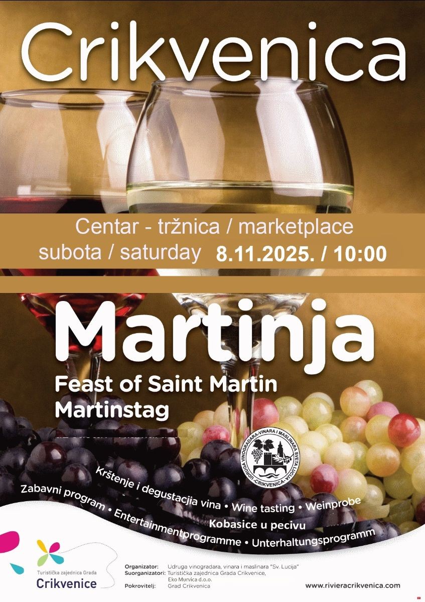 Počinju veseli eno dani u mnogim krajevima Hrvatske pa tako i na području Rivijere Crikvenica. U subotu, 8. studenoga, u 10:00 sati će se ispred Gradske tržnice u Crikvenici (kod „Konzuma“) održati krštenje i degustacija vina. Protokol krštenja vina odradit će se u „režiji“ članova Udruge vinogradara, vinara i maslinara „Sveta Lucija“. Ovaj će sadržaj pratiti i glazbeni program, stoga ne propustite doći.