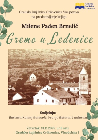 Gradska knjižnica Crikvenica poziva na predstavljanje knjige Milene Pađen Brnelić Gremo u Ledenice koje će se održati u četvrtak, 13. studenoga u Središnjem odjelu, Vinodolska 1 s početkom u 18 sati.