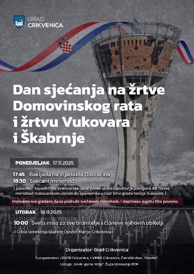 U ponedjeljak, 17. studenog 2025. godine, Crikvenica će s dubokim pijetetom obilježiti Dan sjećanja na žrtve Domovinskog rata i Dan sjećanja na žrtvu Vukovara i Škabrnje.
