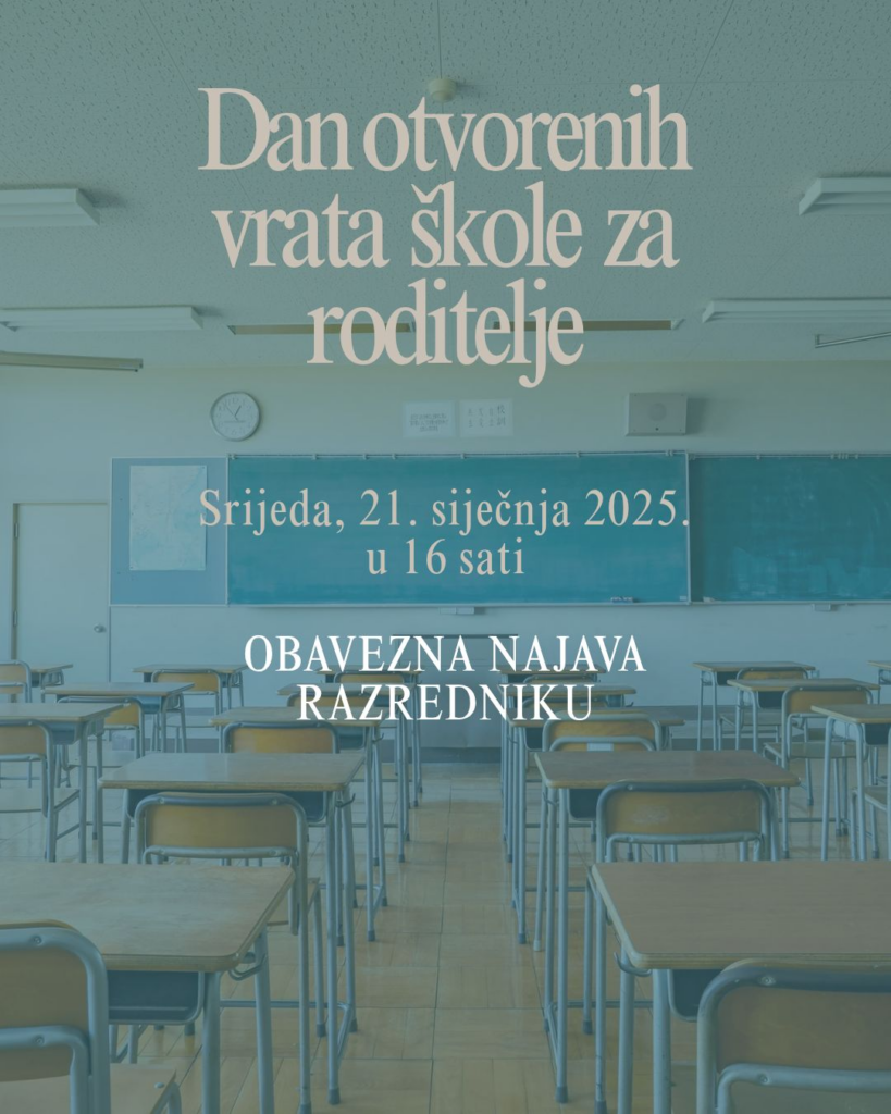 Srednja škola dr. Antuna Barca Crikvenica poziva sve roditelje na Otvorena vrata, koja će se održati u srijedu, 21. siječnja 2026. godine, u periodu od 16:00 do 17:00 sati.