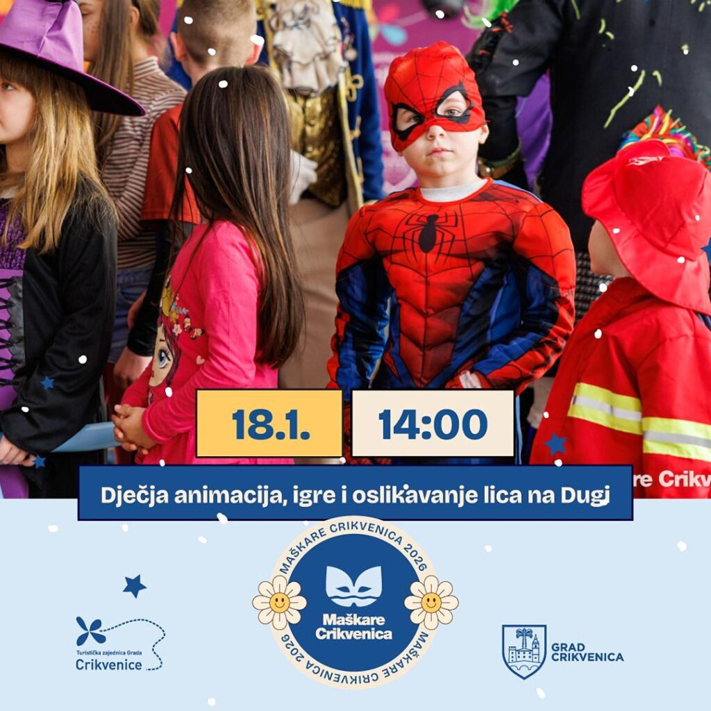 “Maškare u Crikvenici 2026.” nastavljaju se i ovog vikenda. Program u subotu i nedjelju, 17. i 18. siječnja 2026., uključuje događanja na Dugi u Crikvenici, s naglaskom na aktivnosti prilagođene različitim uzrastima.