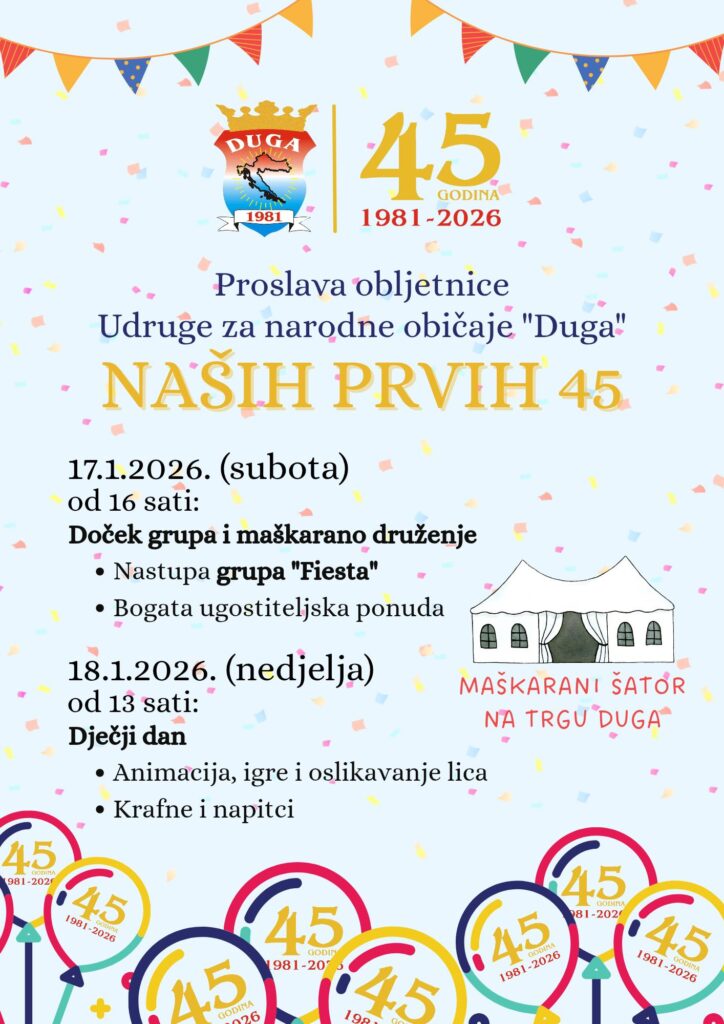 U subotu, 17. siječnja, s početkom u 17:00 sati, održat će se maškarano druženje na Dugi u Crikvenici. Ovaj događaj dio je službenog programa manifestacije i predstavlja nastavak siječanjskih maškaranih aktivnosti. Program uključuje veselu atmosferu i sudjelovanje maškaranih sudionika svih generacija, uz glazbu i sadržaje koji su dio tradicije ove manifestacije. Istovremeno se obilježava 45. obljetnica djelovanja Udruge za narodne običaje Duga. Tijekom večeri predviđen je i glazbeni nastup sastava Fiesta, koji će dodatno doprinijeti programu druženja.