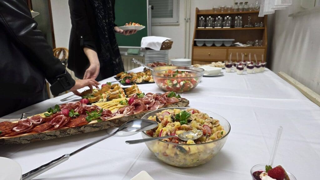 Za prigodni domjenak pobrinuli su se domaćini – učenici strukovnog smjera “Kuhar/ica” i “Konobar/ica” uz svoje voditelje, profesore Marka Pađena i Dragana Viskovića.