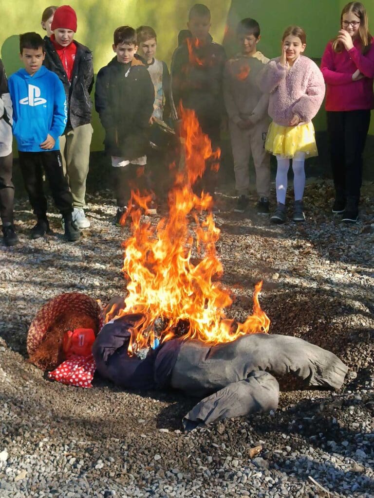 Mesopusta, krivca za svaku lošu ocjenu, neopravdani sat, lošu bilješku ili opomenu, zapalili su u dvorištu škole te glazbom i plesom oprostili se od maškara.