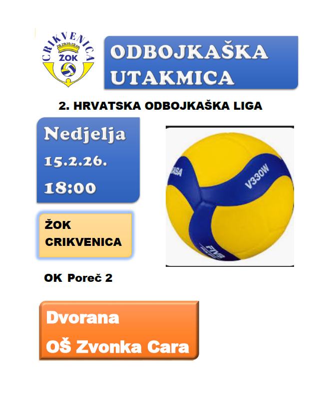 U sklopu 2. Hrvatske odbojkaške lige, Ženski odbojkaški klub Crikvenica u nedjelju, 15. veljače 2026. godine, odigrat će prvenstvenu utakmicu protiv ekipe OK Poreč 2.
