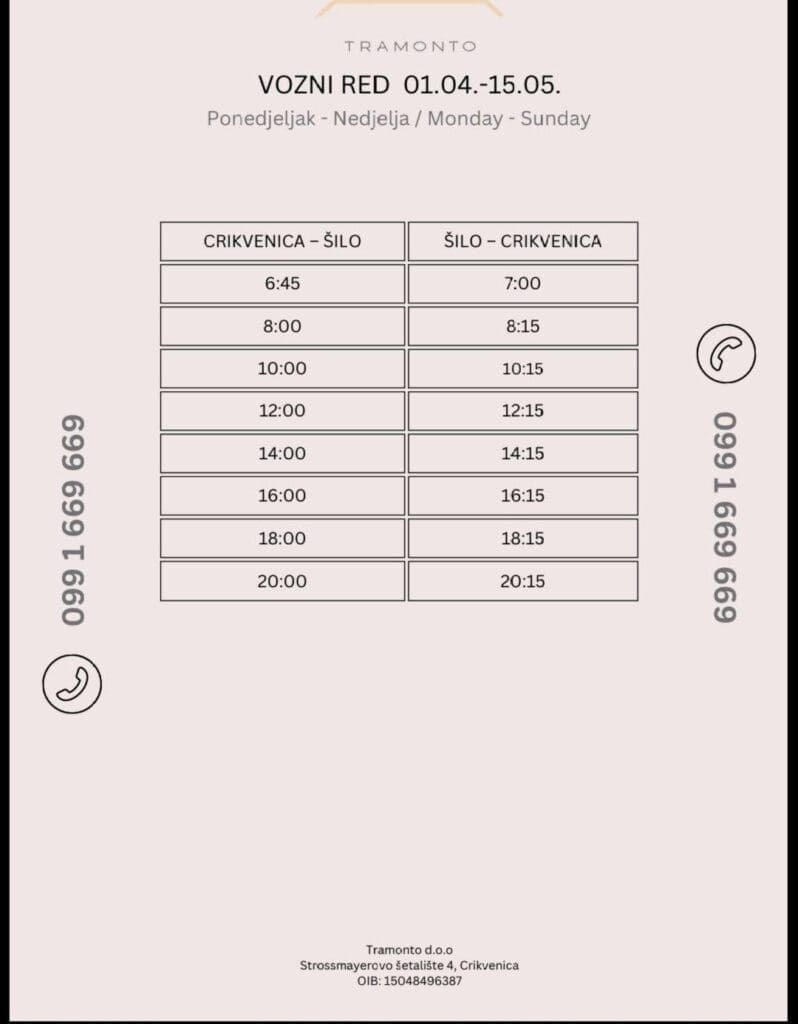 Iz Šila prema Crikvenici polasci su u 7:00, 8:15, 10:15, 12:15, 14:15, 16:15, 18:15 i 20:15 sati.