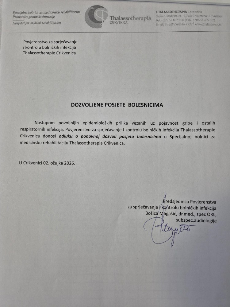 Nastupom povoljnijih epidemioloških prilika vezanih uz pojavnost gripe i ostalih respiratornih infekcija, Povjerenstvo za sprječavanje i kontrolu bolničkih infekcija Thalassotherapije Crikvenica donijelo je Odluku o ponovnoj dozvoli posjeta bolesnicima u Thalassotherapiji Crikvenica.