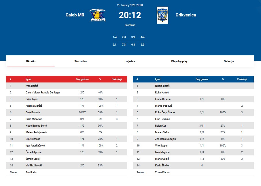 Do kraja susreta domaća momčad uspjela je sačuvati stečenu prednost i privesti utakmicu kraju u svoju korist. Podsjetimo, VK Crikvenica je u regularnom dijelu sezone na domaćem terenu slavio protiv Galeba rezultatom 19:16, no na teškom gostovanju u Makarskoj, gdje je poražen i lider prvenstva te najjača momčad lige VK Siscia, nisu imali šanse.