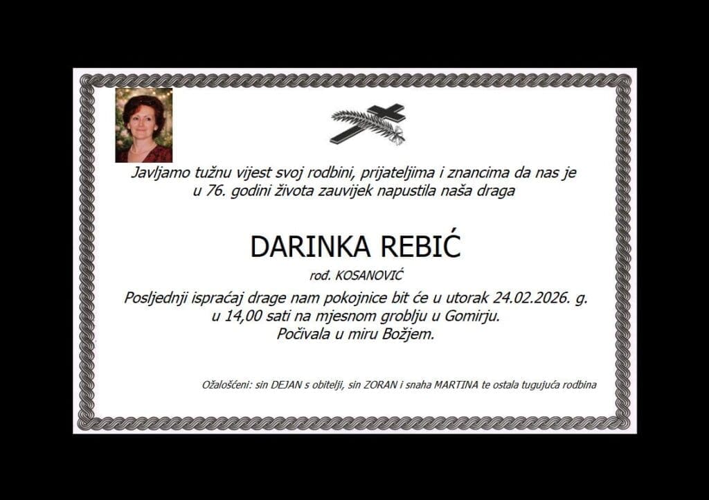 DARINKA REBIĆ rođ. Kosanović Ime i prezime: Darinka Rebić rođ. Kosanović Datum pogreba: 24.02.2026. u 14:00 sati Mjesto pogreba: Mjesno groblje u Gormirju