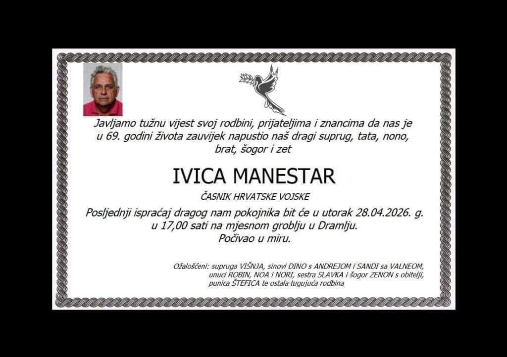 IVICA MANESTAR Ime i prezime: Ivica Manestar Datum pogreba: 28.04.2026. u 17:00 sati Mjesto pogreba: Mjesno groblje u Dramlju