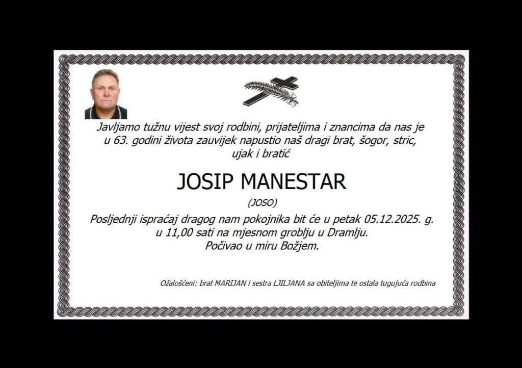 JOSIP MANESTAR Ime i prezime: Josip Manestar Datum pogreba: 05.12.2025. u 19:00 sati Mjesto pogreba: Mjesno groblje u Dramlju