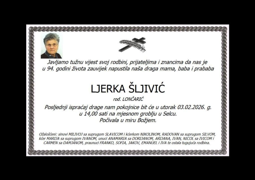 LJERKA ŠLJIVIĆ rođ. Lončarić Ime i prezime: Ljerka Šljivić rođ. Lončarić Datum pogreba: 03.02.2026. u 14:00 sati Mjesto pogreba: Mjesno groblje u Selcu