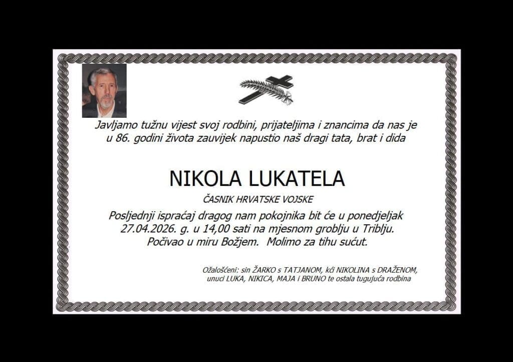 NIKOLA LUKATELA Ime i prezime: Nikola Lukatelo Datum pogreba: 27.04.2026. u 14:00 sati Mjesto pogreba: Mjesno groblje u Triblju
