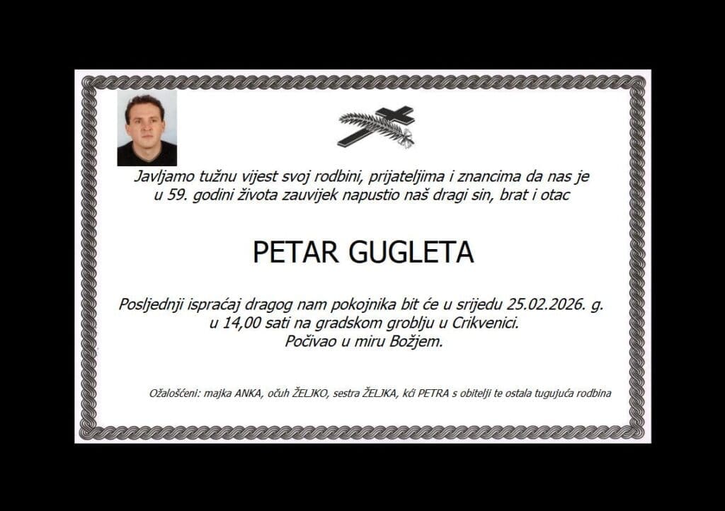 PETAR GUGLETA Ime i prezime: Petar Gugleta Datum pogreba: 25.02.2026. u 14:00 sati Mjesto pogreba: Gradsko groblje u Crikvenici