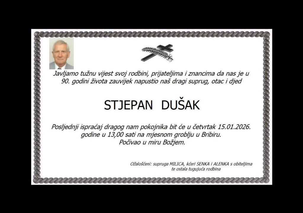 STJEPAN DUŠAK Ime i prezime: Stjepan Dušak Datum pogreba: 15.01.2026. u 13:00 sati Mjesto pogreba: Mjesno groblje u Bribiru
