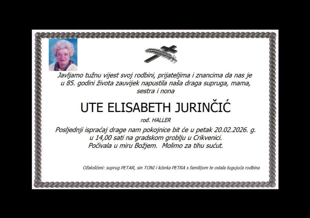 UTE ELISABETH JURINČIĆ rođ. Haller Ime i prezime: Ute Elisabeth Jurinčić rođ. Haller Datum pogreba: 20.02.2026. u 14:00 sati Mjesto pogreba: Gradsko groblje u Crikvenici