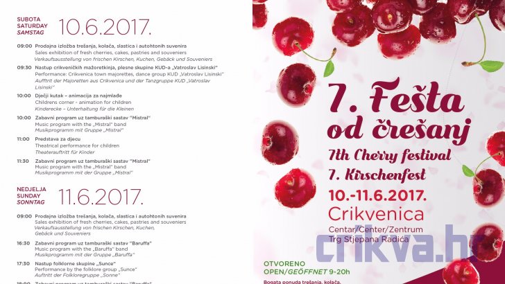Početak 7. Fešte od črešanj zakazan je za subotu, 10. lipnja u 9 sati na Trgu Stjepana Radića u Crikvenici, a tijekom slatkog vikenda priprema se sljedeći program: