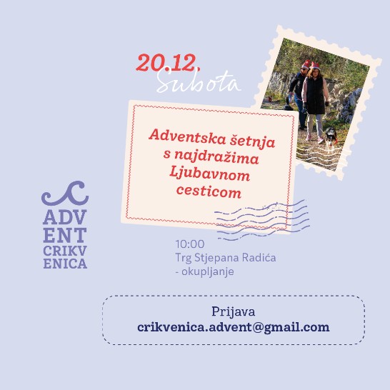Prva adventska šetnja kreće u subotu s Trga Stjepana Radića, kraj kućice Djeda Božićnjaka. Prijavljene očekuje vođena tura atraktivnom Ljubavnom cesticom, u trajanju od oko 2 sata i 30 minuta. Uživajte u odličnoj atmosferi i pažljivo organiziranoj terenskoj koordinaciji. TZG Crikvenice daruje sudionicima prigodne poklone koji će upotpuniti vaš adventski ugođaj.