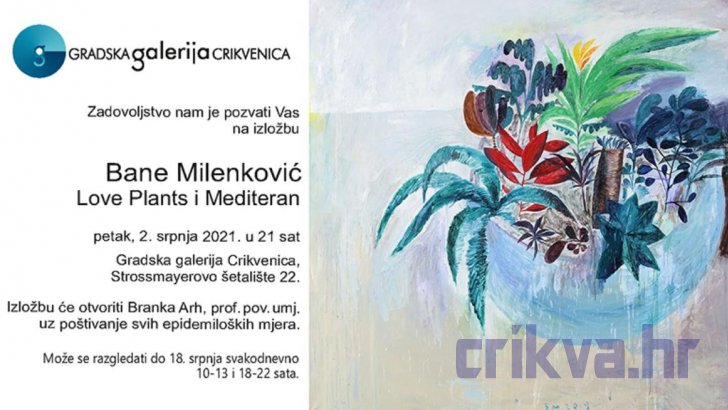 U petak s početkom u 21 sat u Gradskoj galeriji Crikvenica bit će otvorena izložba Love Plants i Meduteran slikara Bane Milenkovića. Izložba će biti postavljena do 18. srpnja i možete je razgledati svakoga dana od 10 do 13 i od 18 do 22 sata