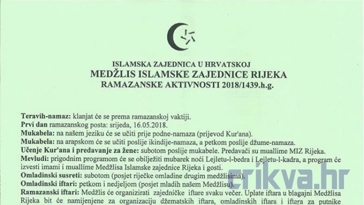 Današnjim zalaskom sunca nad Kvarnerom u 20:30 sati i prvim teravih namazom u 22:24 sata na području PGŽ-e počinje mjesec Ramazan. Početak posta je 16. svibnja (srijeda) u 3:12 sati.