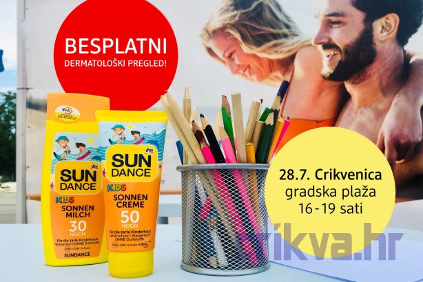U subotu, 28. srpnja, na gradskoj plaži u Crikvenici održat će se besplatni dermatološki pregled koji dm organizira u sklopu inicijative "Sunce se nosi bezbrižno". U Crikvenici će madeže i promjene na koži od 16 do 19 sati pregledavati doc. dr. sc. Marija Buljan te će svim posjetiteljima biti na raspolaganju za pitanja i stručne savjete.